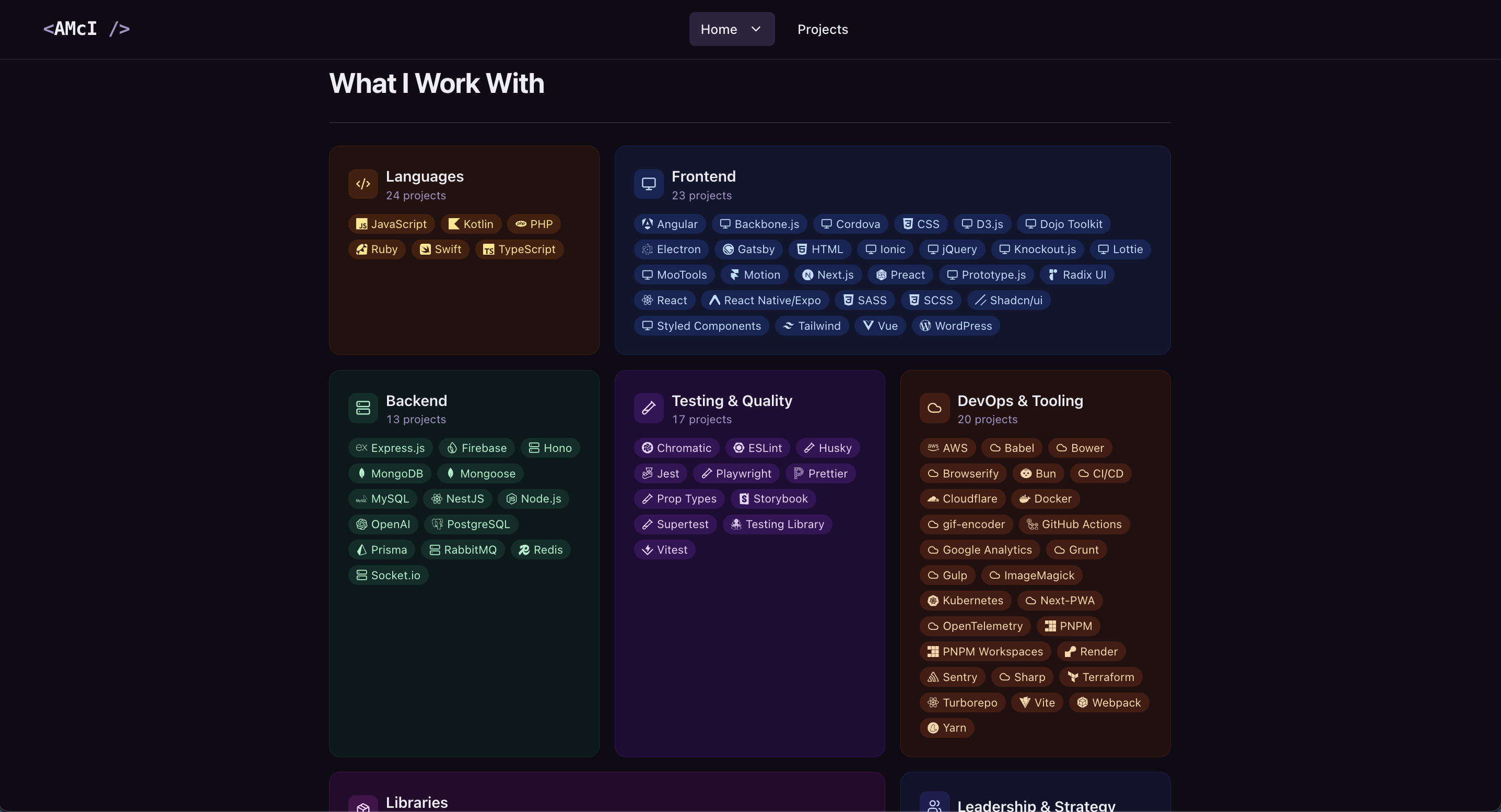 I built the whole thing from scratch: design, SEO, analytics, routing, UX, the lot. It's React with TypeScript, dark mode, scroll animations, and a projects section that filters by skill, with Tailwind for styling and Shadcn/ui for the components.