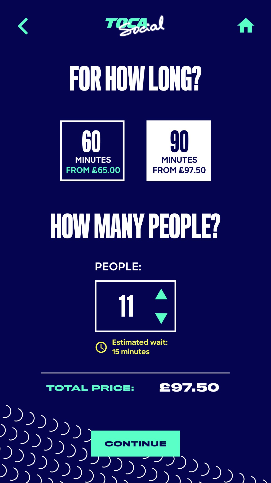 The Kiosk System was a touchscreen application deployed at TOCA Social venues across the UK. Walk-in customers used it to book interactive football gaming sessions on-site. Customers with existing bookings could check in by scanning a QR code. The system connected to physical card terminals for payments and displayed real-time availability and pricing.