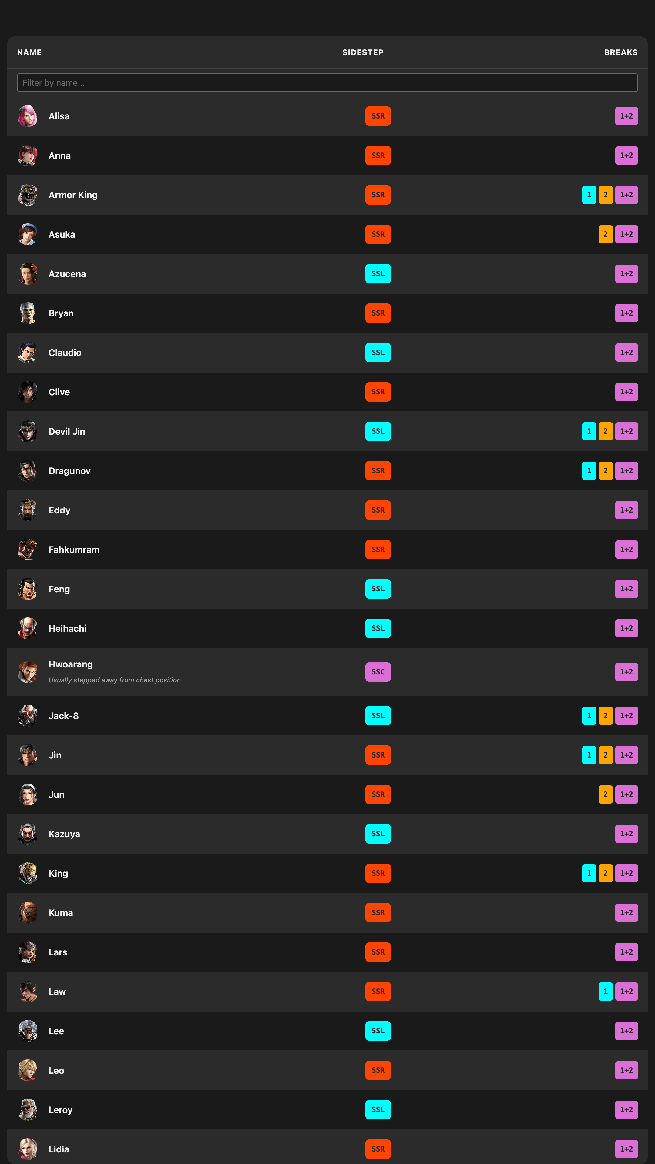 I own the whole thing: filters, layout, data updates, store submission. It's lightweight for now. The app lists all characters with avatars, sidestep badges (SSL, SSR, SSC), and throw break pills. You can filter by name or sidestep direction. Data lives in JSON, with a season field for when balance patches drop. I pull character art from TekkenWarehouse and keep the dataset updated as the roster changes. Built with React Native and Expo, it supports Android, iOS, and web, with dark and light themes and a layout tuned for quick scanning.