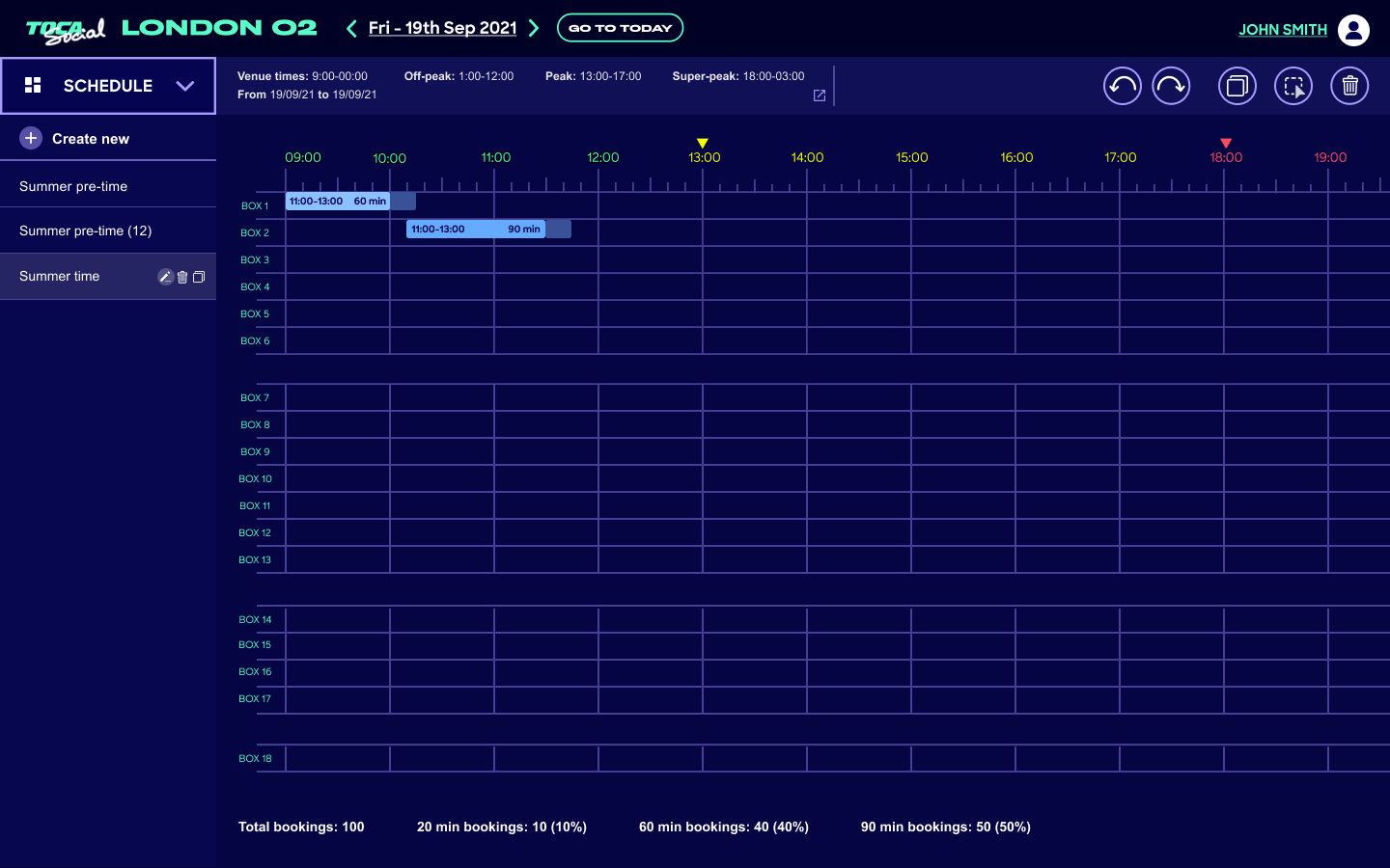 I worked with venue operations and finance teams to understand pricing models and scheduling requirements. I defined the template and schedule domain model, coordinated API contracts with backend teams, and managed sprint planning. On development, I designed the Redux store structure with redux-undo for undo/redo, built the API integration layer for schedules, box slots, pricing, and recurrence services, and developed the CSS Grid-based timeline visualisation. I'm proud of how this fit the aesthetic for TOCA at the time. Despite being heavily complex, it was viewed favourably and rarely had issues in production, thanks to extensive testing before deployment.