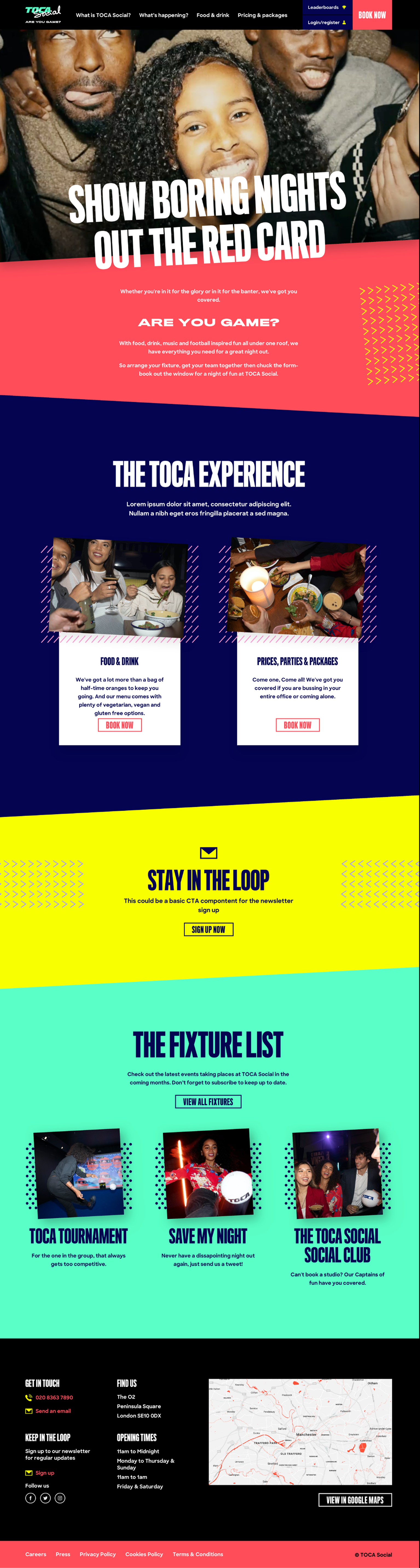 The TOCA Social Website was the central place to book online for TOCA Social. If you wanted to make a booking as a member of the public, this was your main interface. TOCA Social offers sports entertainment: you book a slot to use custom hardware where a football acts as the controller. The site was built to support the launch and drive bookings. There was no website before this existed.